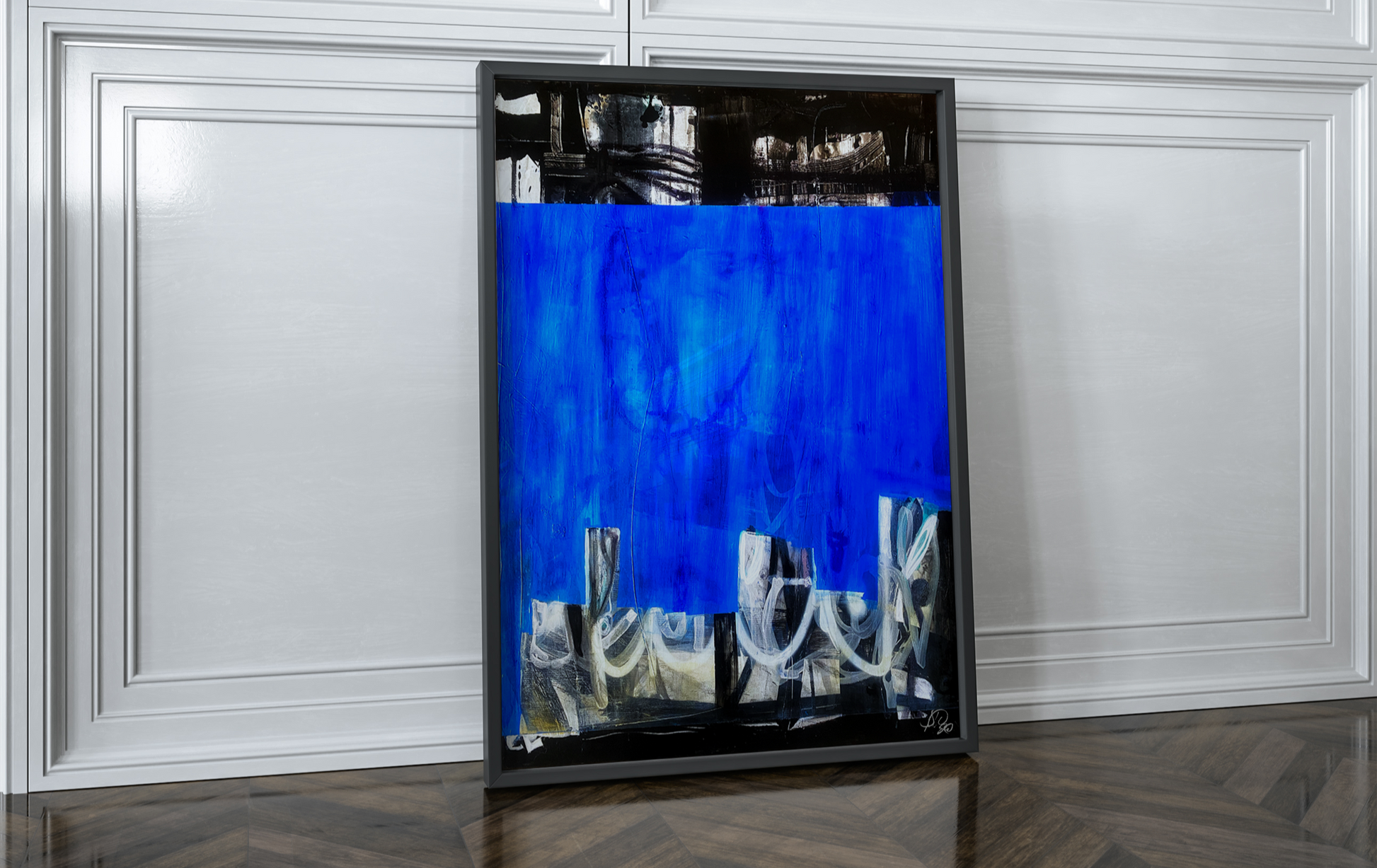 "Cover Slip," an original abstract blue landscape painting, offers a textured, tranquil scene. Rich blues contrast with bold black and white accents in this modern, contemporary artwork. Hand-painted acrylic on canvas, this unique piece adds serene elegance to any home or office.
