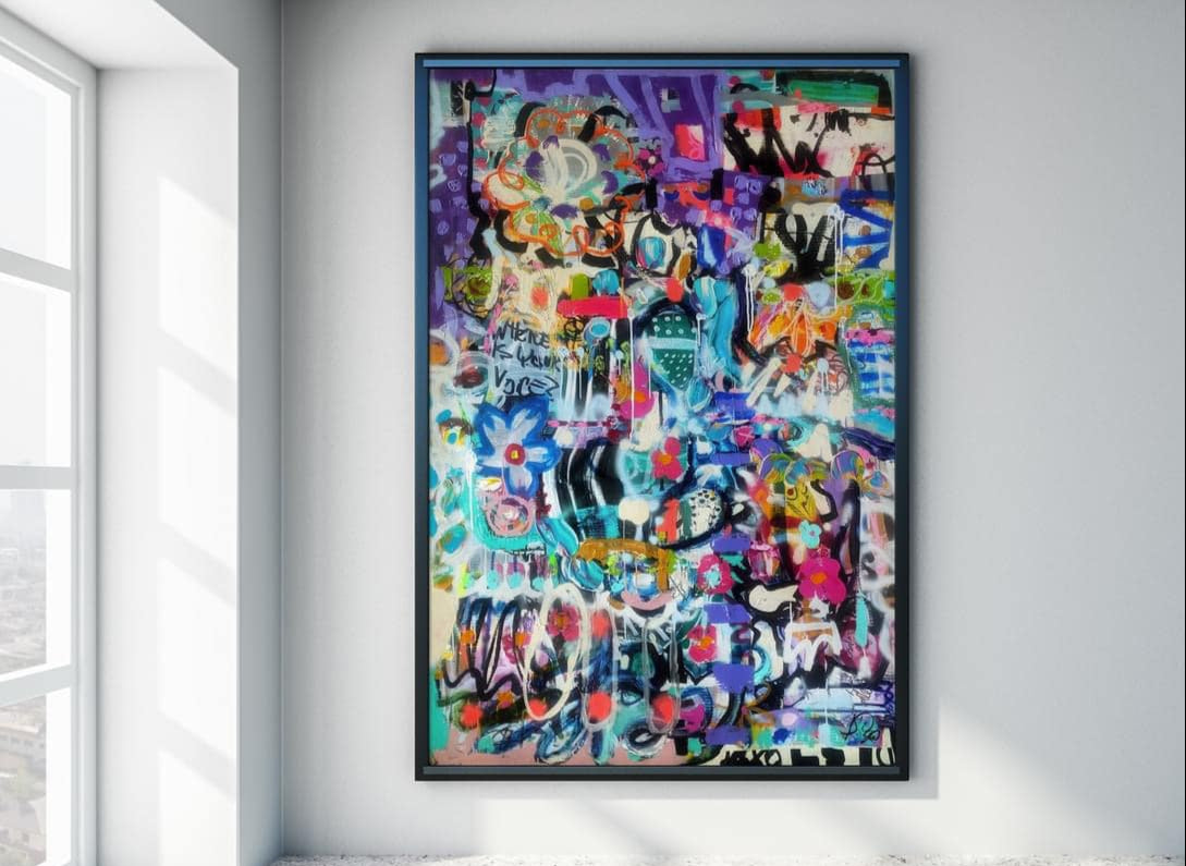 This stunning large-scale abstract painting (32x72 inches) is a powerful expression of movement, energy, and color. Created in 2024, the artwork features a masterful combination of acrylic, heavy-body acrylic, and spray paint on raw cardboard, enhancing its urban, industrial aesthetic.